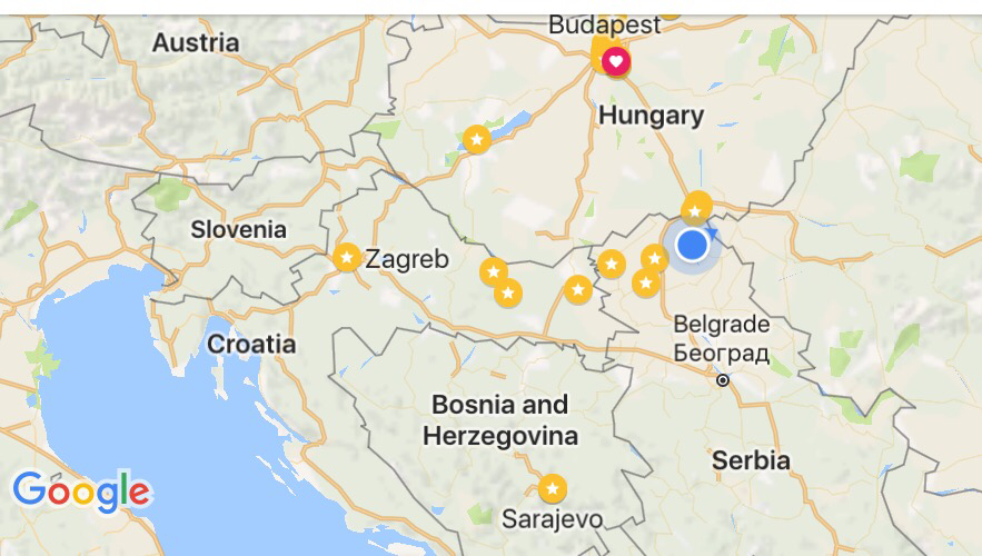 I took this shot on the second half of my walk around Senta (see pic below for general location) this morning. It was about 5:30. This guy seems to have been there awhile. The river’s flow was quiet this morning. He was there early, among the other fishermen hoping to catch something.